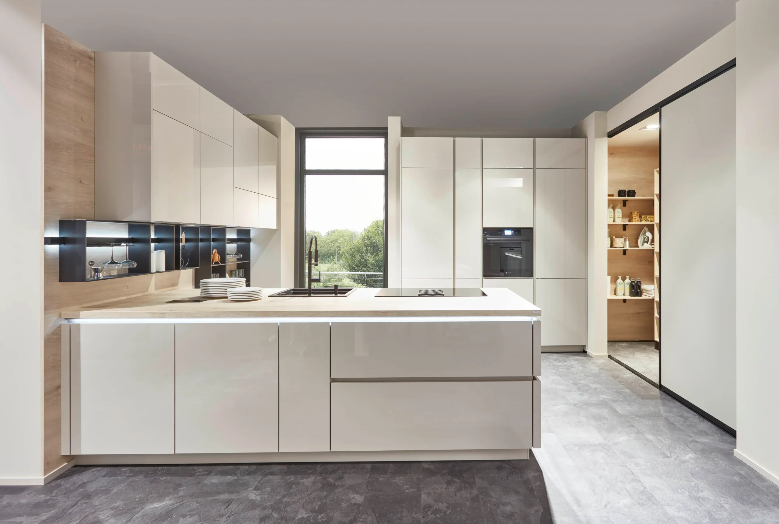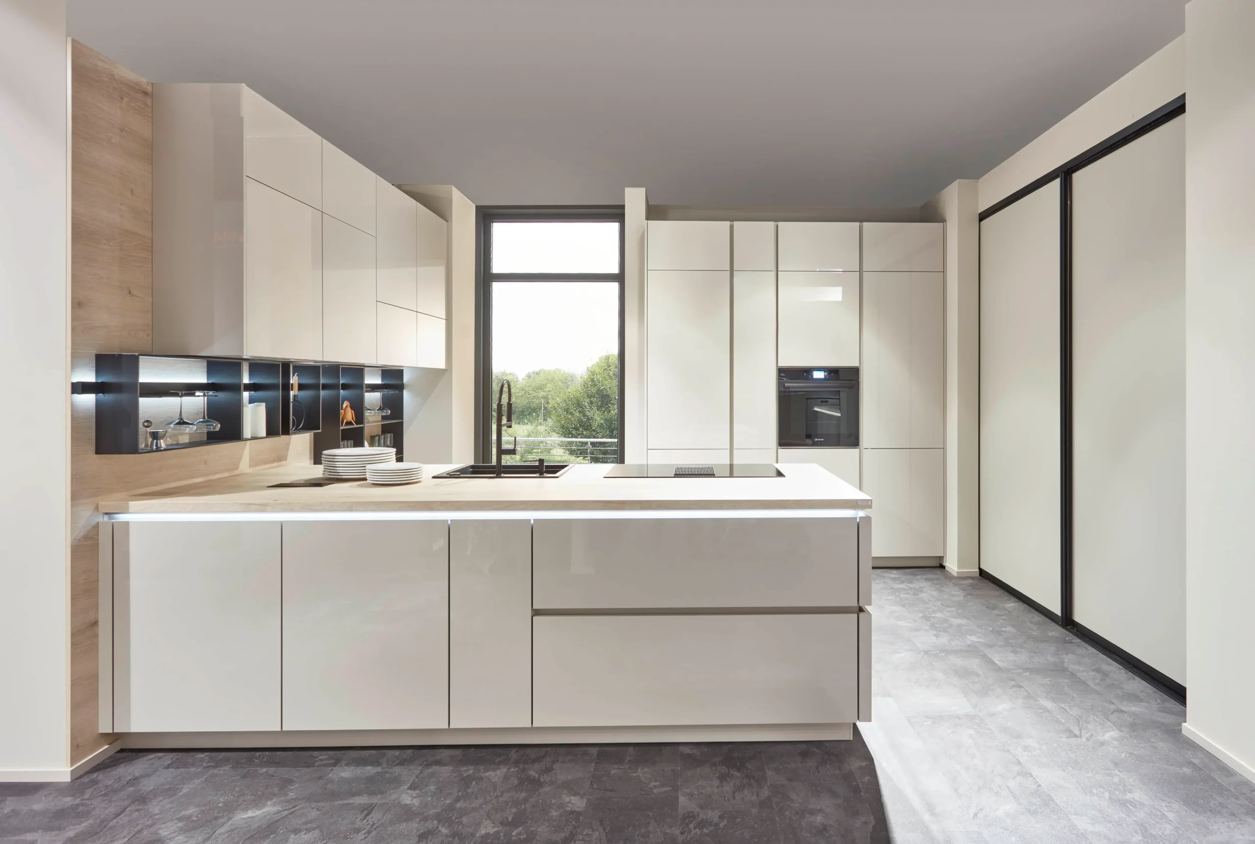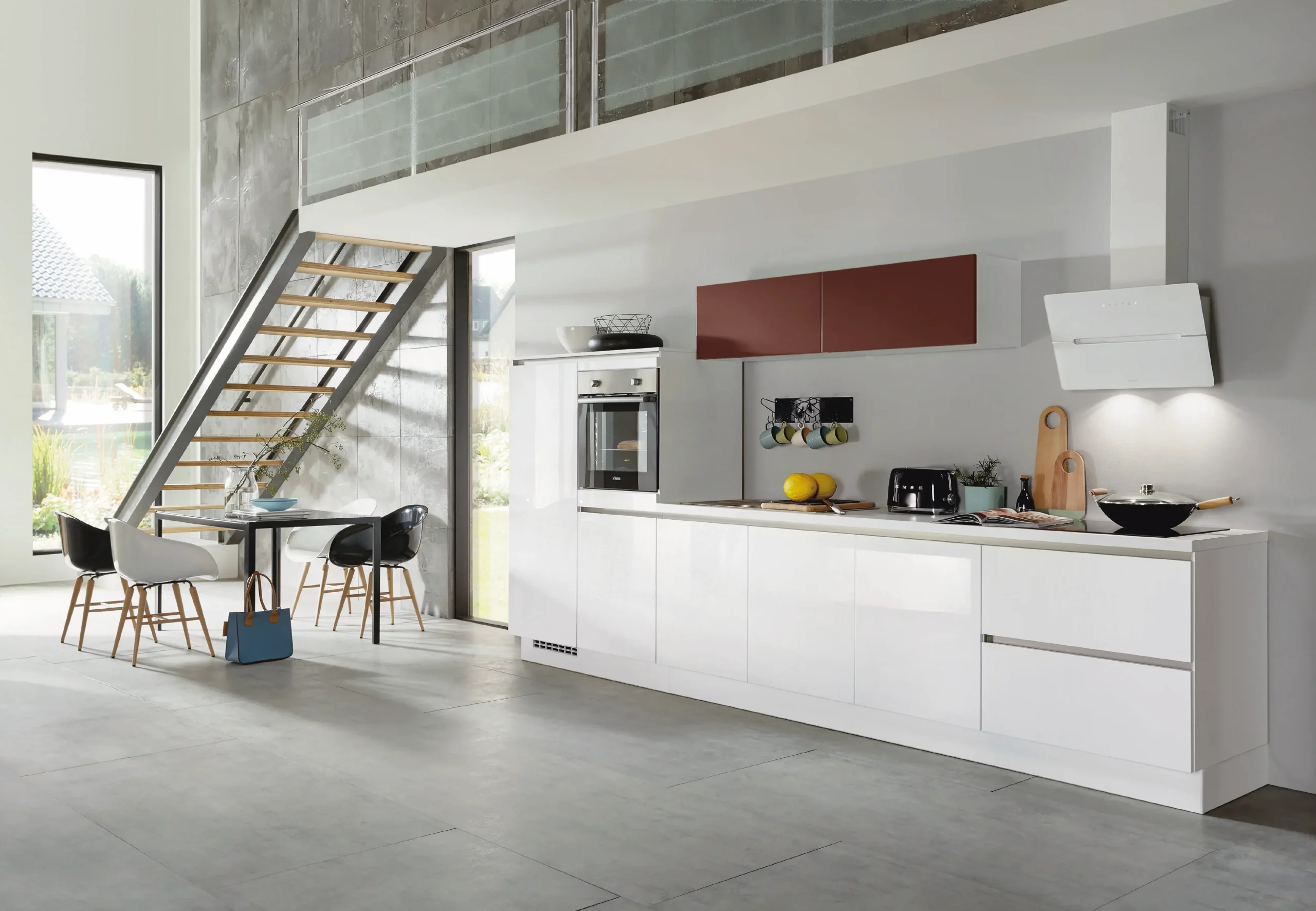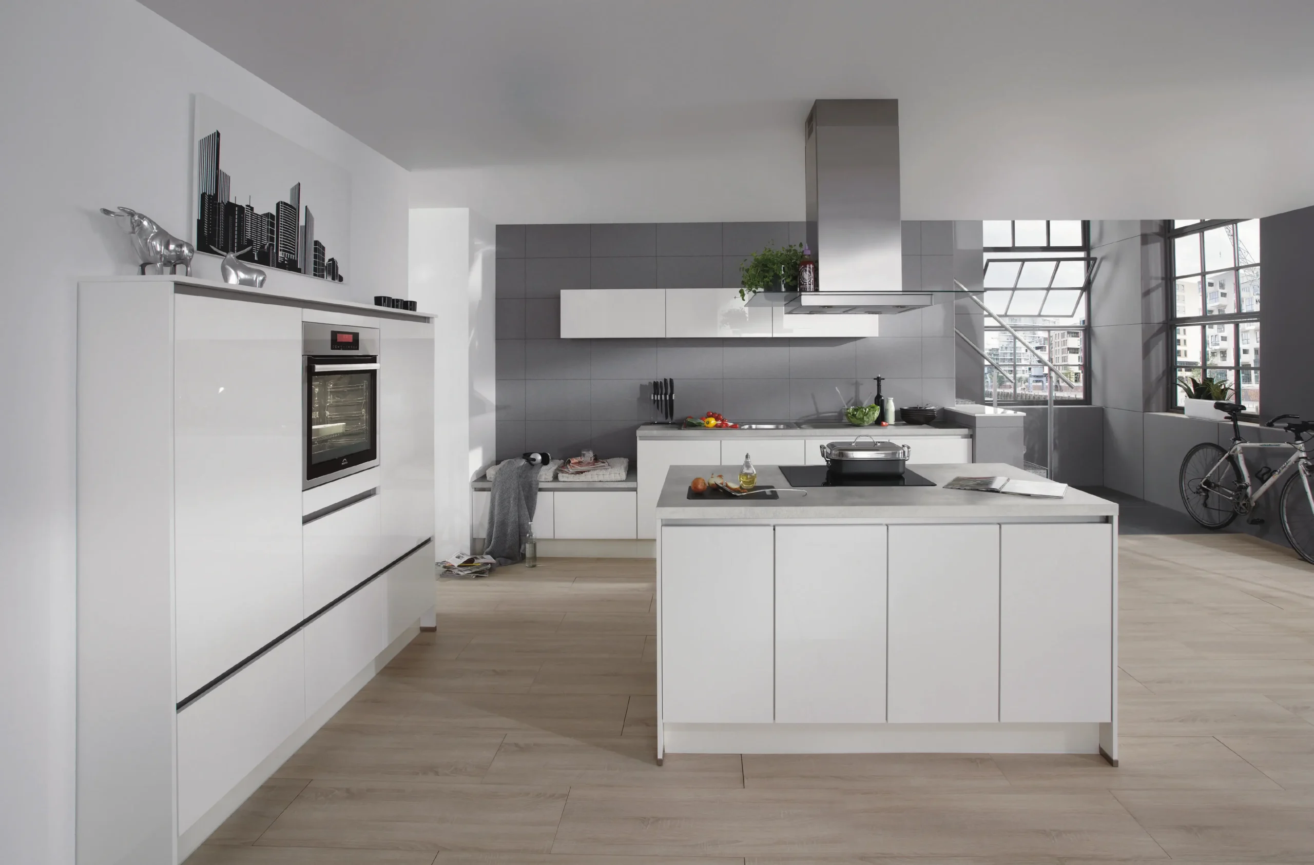 Introducing the Lounge Collection, where comfort meets sophistication. True to its name, this collection creates an inviting atmosphere. The high gloss white cabinet fronts impart a sleek and modern appearance, especially striking when complemented by wood accent panels or shelving units. This combination effortlessly transforms the kitchen into a stylish and cozy space for cooking, dining, and working.