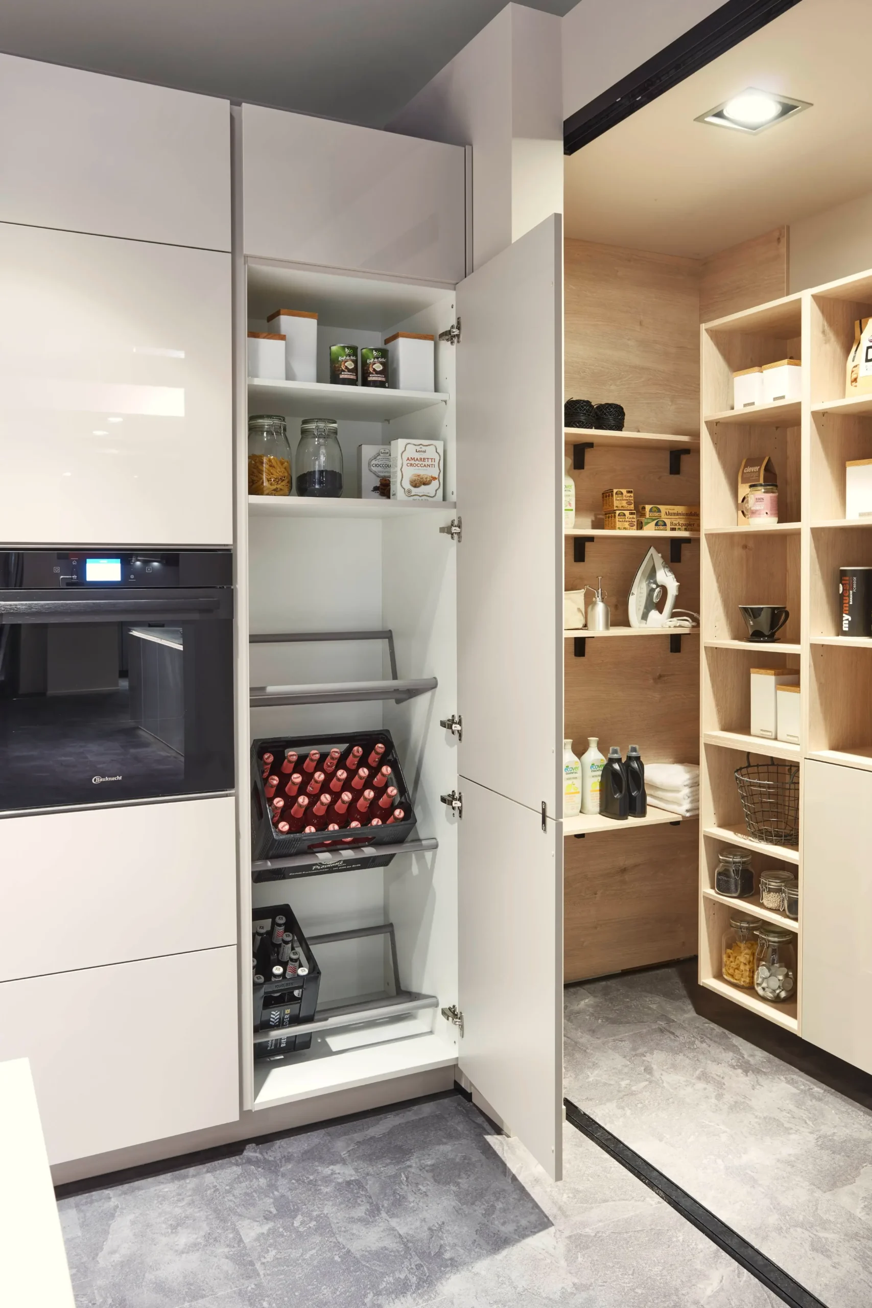 Explore the functionality of stylish open shelving within the Lounge Collection. Modular in design, these shelves are perfect for keeping cookbooks or dry goods within easy reach. Available in various shapes and sizes, they adapt seamlessly to the kitchen’s layout. Cleverly inset between cabinet ends and adjacent walls, these shelves maximize every inch of space in this chic urban setting, ensuring both practicality and aesthetic appeal.